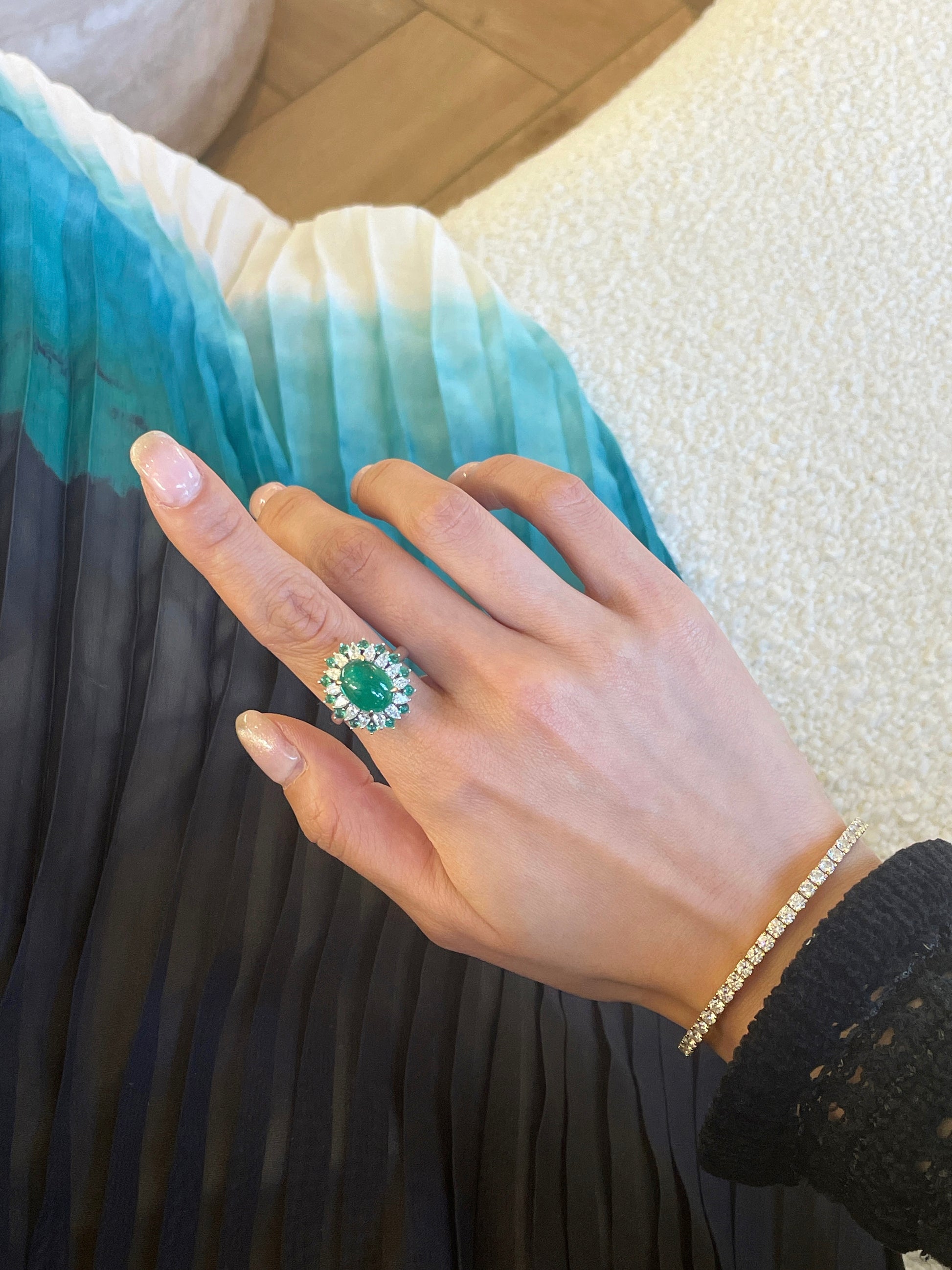 Nature's beauty captured in a ring. Behold the captivating Fantasilvia Cabochon Emerald & Pear Diamond Blossoming Ring, featuring a radiant cabochon emerald haloed by natural pear-shaped diamonds. Exquisite craftsmanship meets timeless elegance.