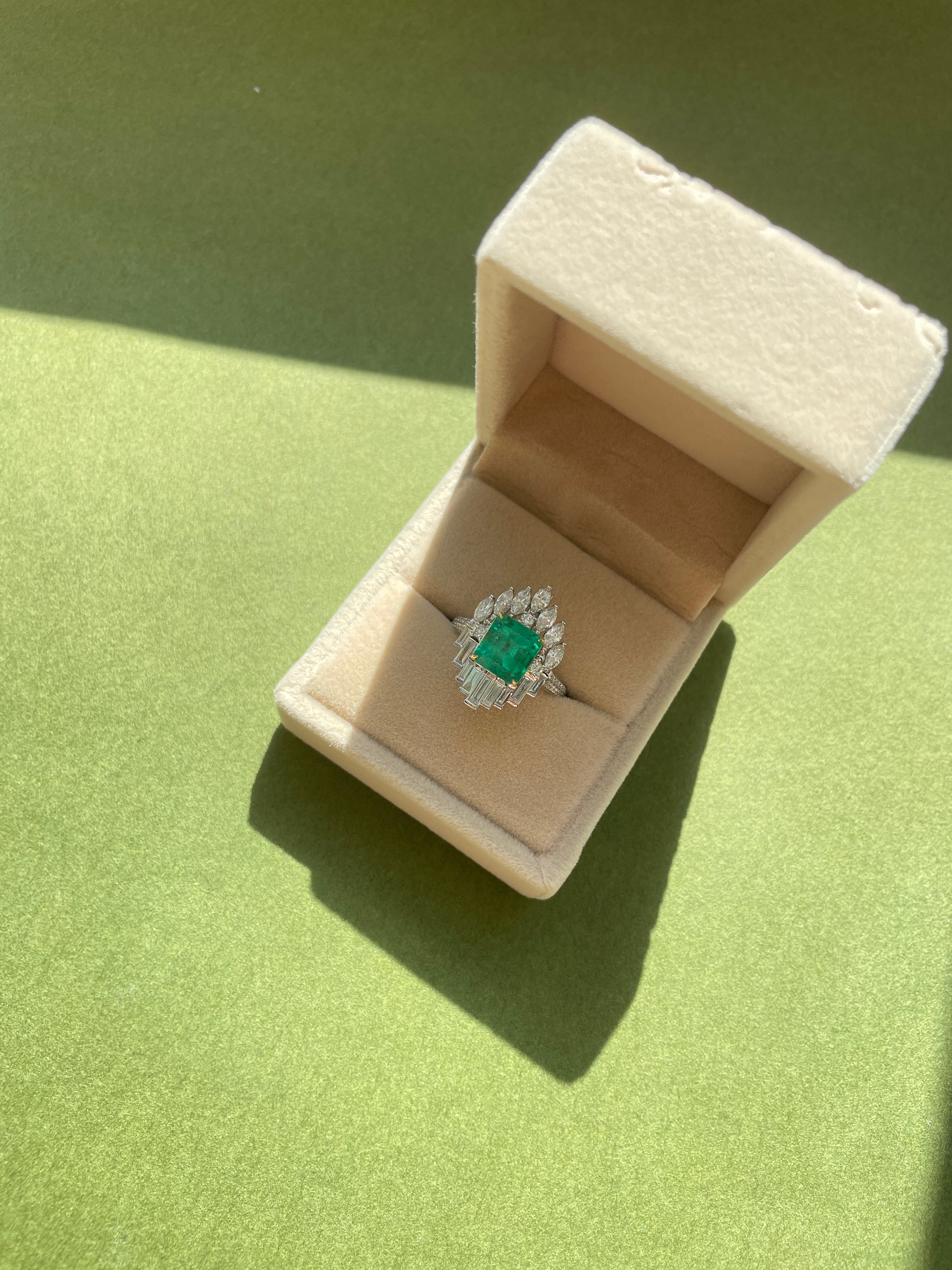 Fantasilvia Diamond & Emerald Solitaire Halo Ring, unique flame designed,