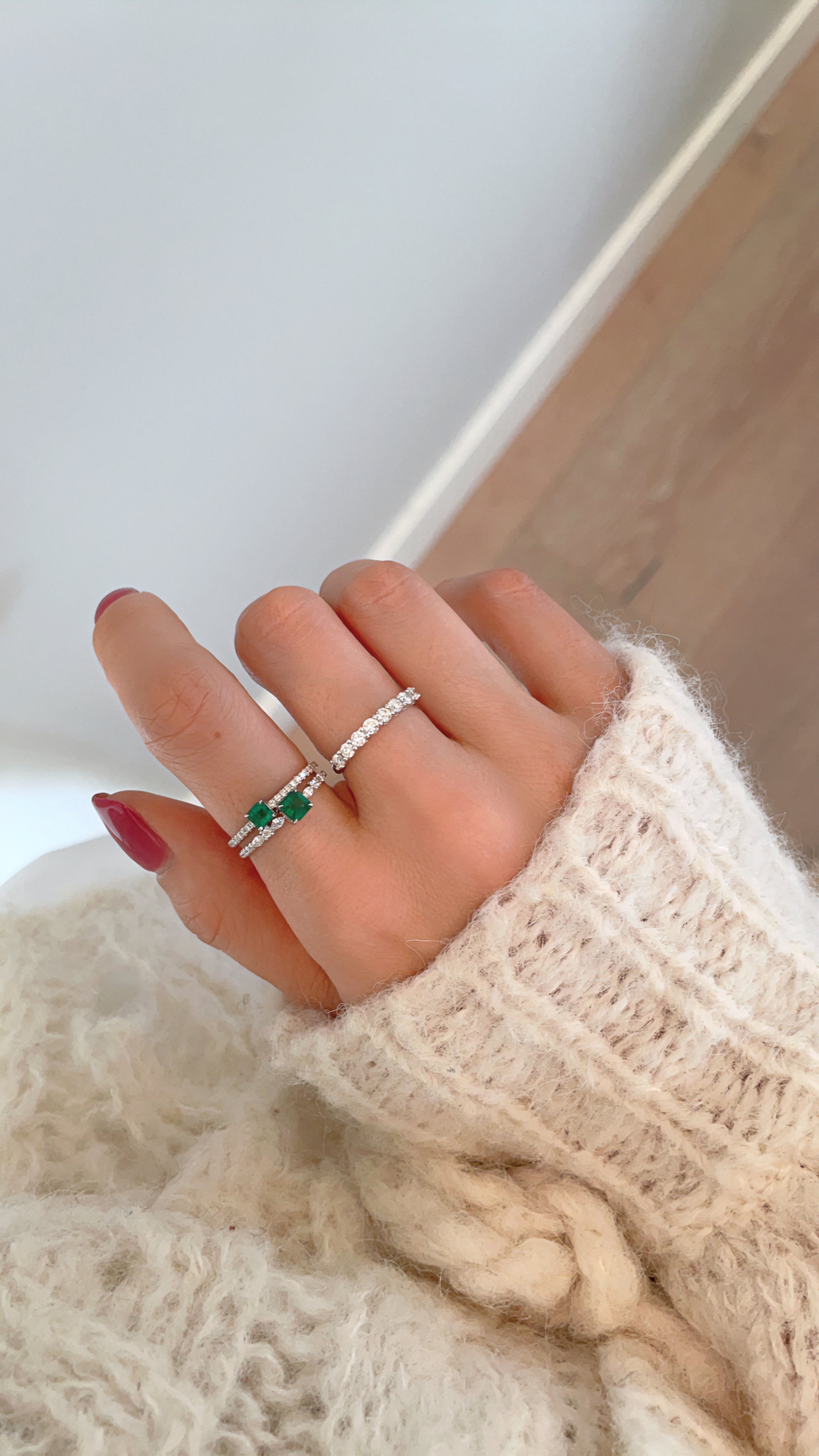 Paried with the Fantasilvia Round Diamond Half Eternity Ring in the photos