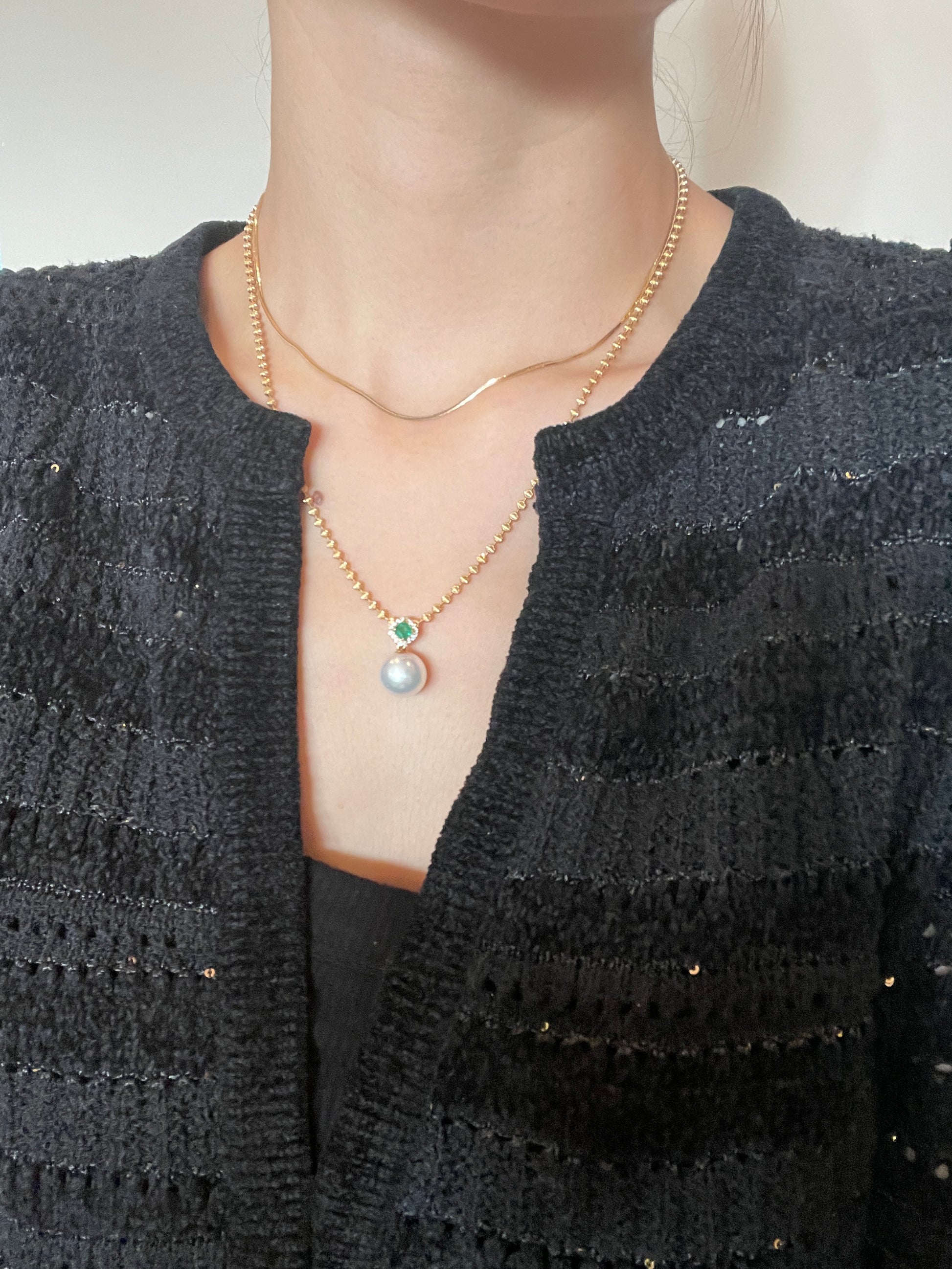 The Fantasilvia Pearl & Emerald Halo Drop Pendant highlights a stunning white south sea 12 mm pearl. This pendant also includes a stunning pave halo emerald that is connected to the 12mm pearl.