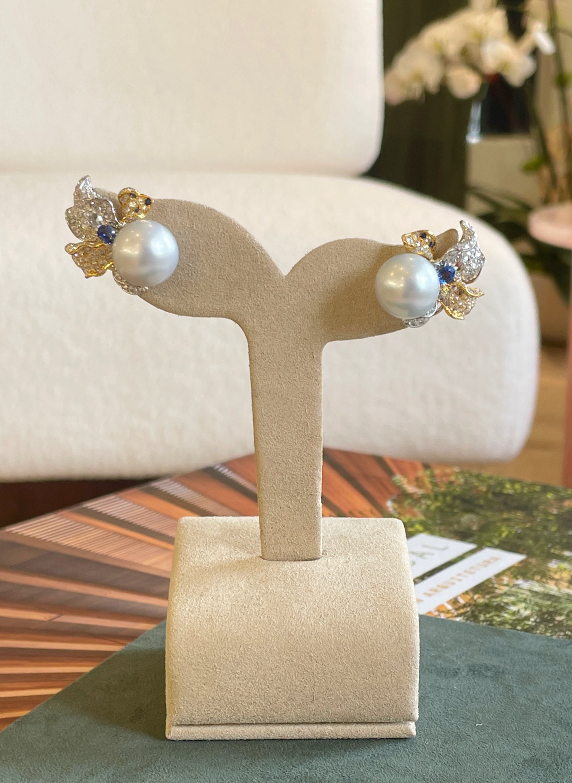 This pair of stunning Pearl Earrings features two gorgeous 12.9 mm south sea round pearls, natural colorless diamond, the best quality natural crown-flower-coloured blue sapphires.