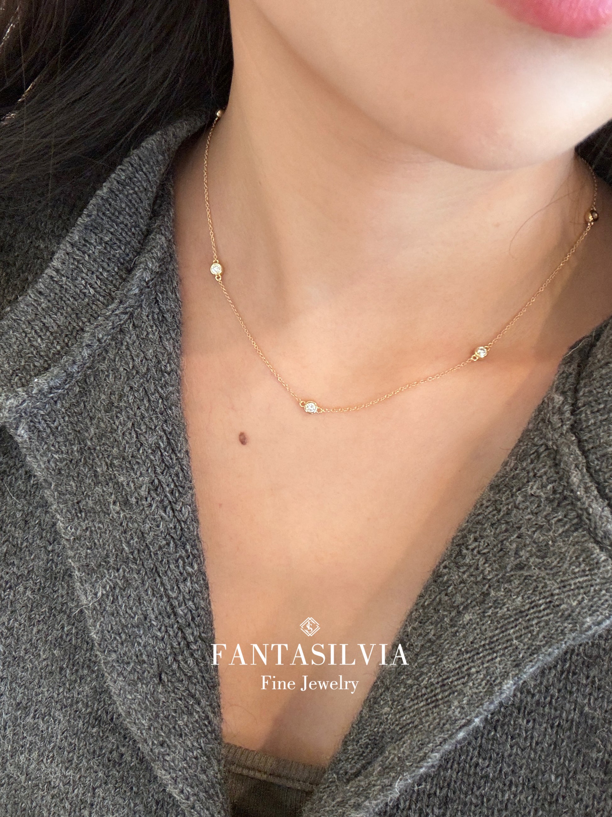 Delicate yet quietly radiant, the Six Lab Diamond Bubble Necklace features six bezel-set lab-grown diamonds evenly spaced along a fine gold chain. Each diamond catches the light with subtle brilliance, creating a soft rhythm that feels effortless and modern. Designed for everyday wear, it layers beautifully or shines on its own as a minimal statement.