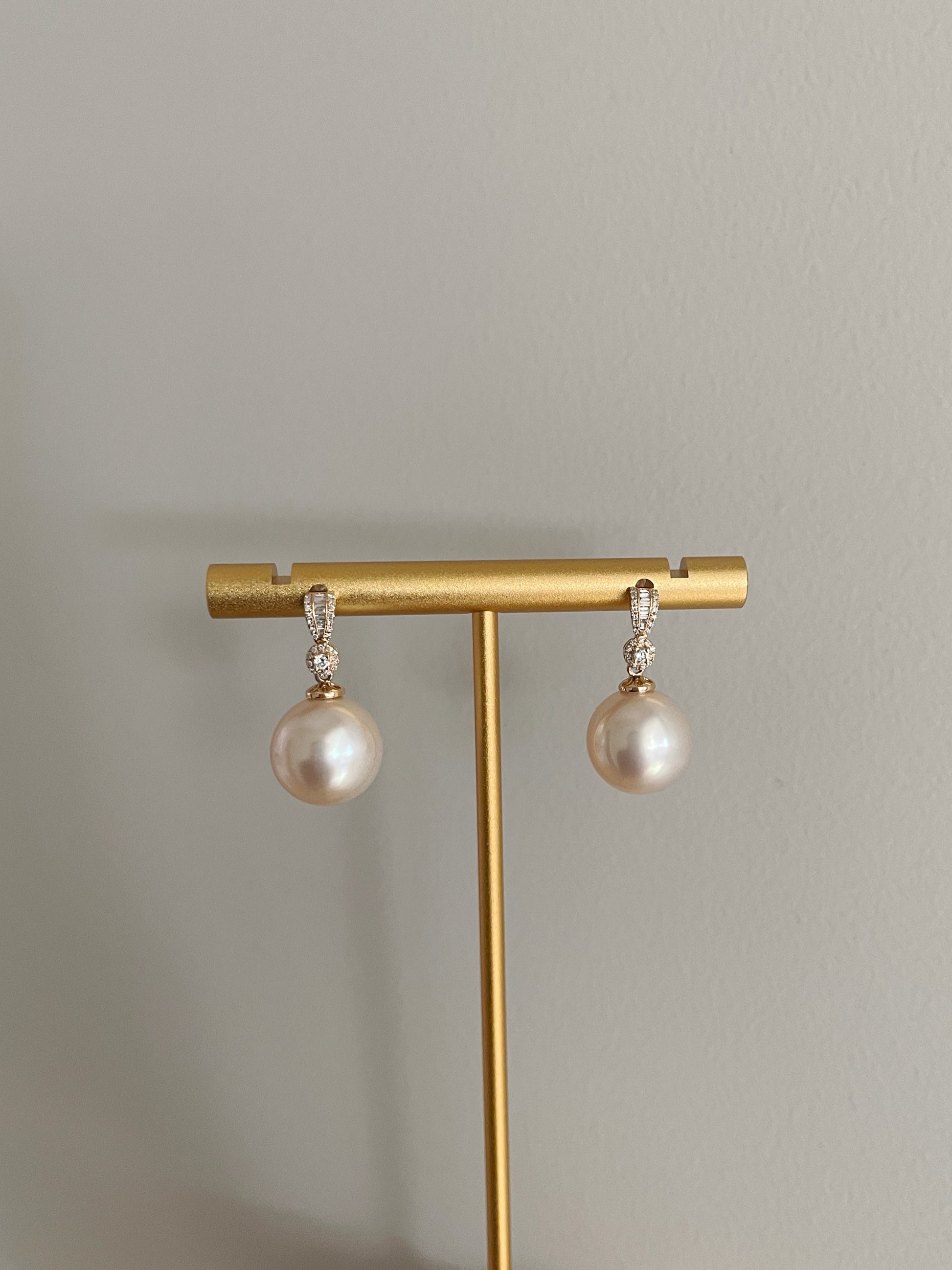 The Fantasilvia Pearl Drop Earrings features two gorgeous 12mm south sea round pearls with rose and gold overtones, that dangles from gorgeous natural diamond connectors.