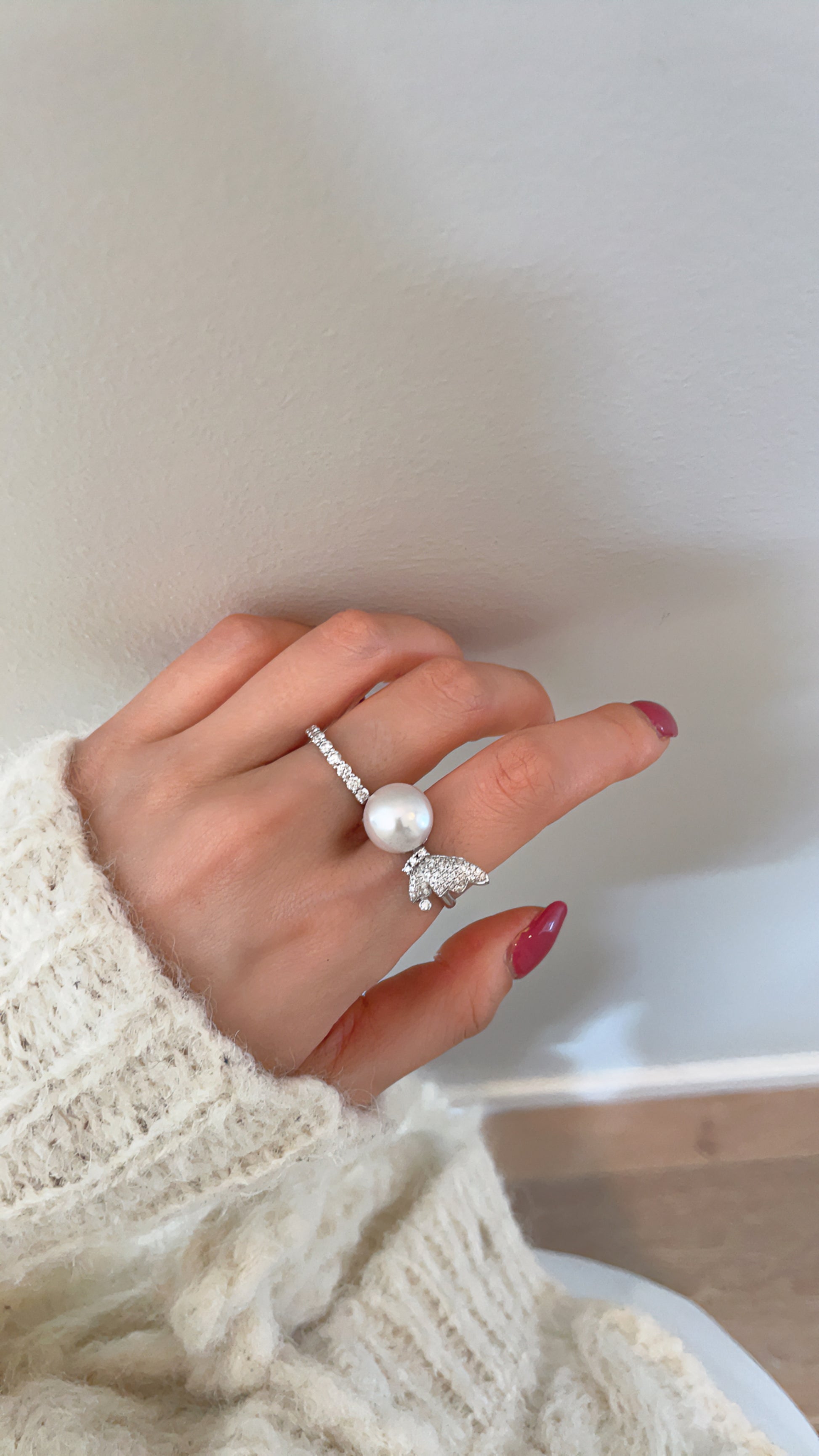 The Fantasilvia South Sea Pearl Ring, with a angel wing design. The wing is made of natural diamond and 18K white gold.