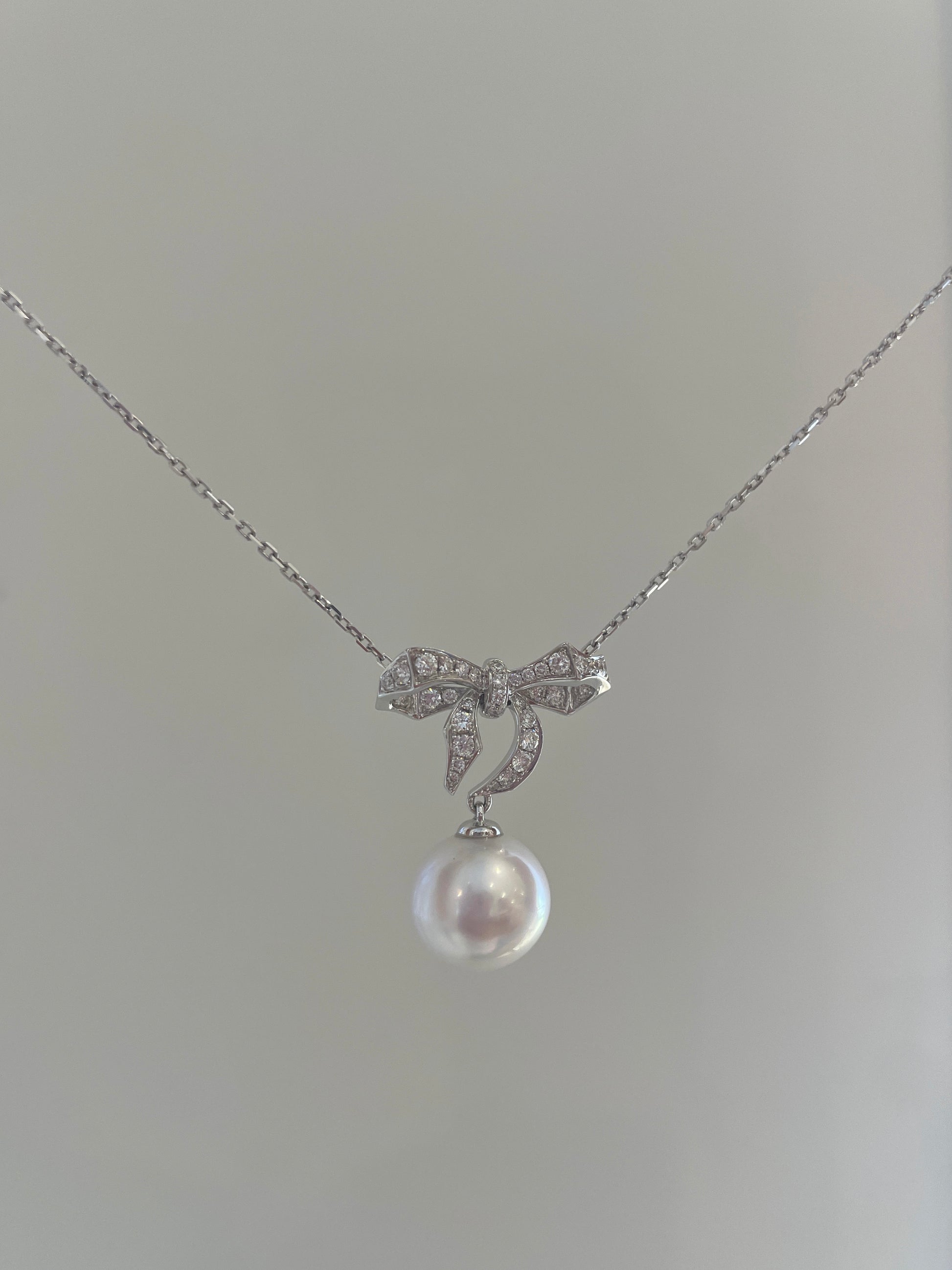 Pearls that bow to your style. Adorn your neck with the timeless beauty of South Sea white pearls in a bow tie necklace.