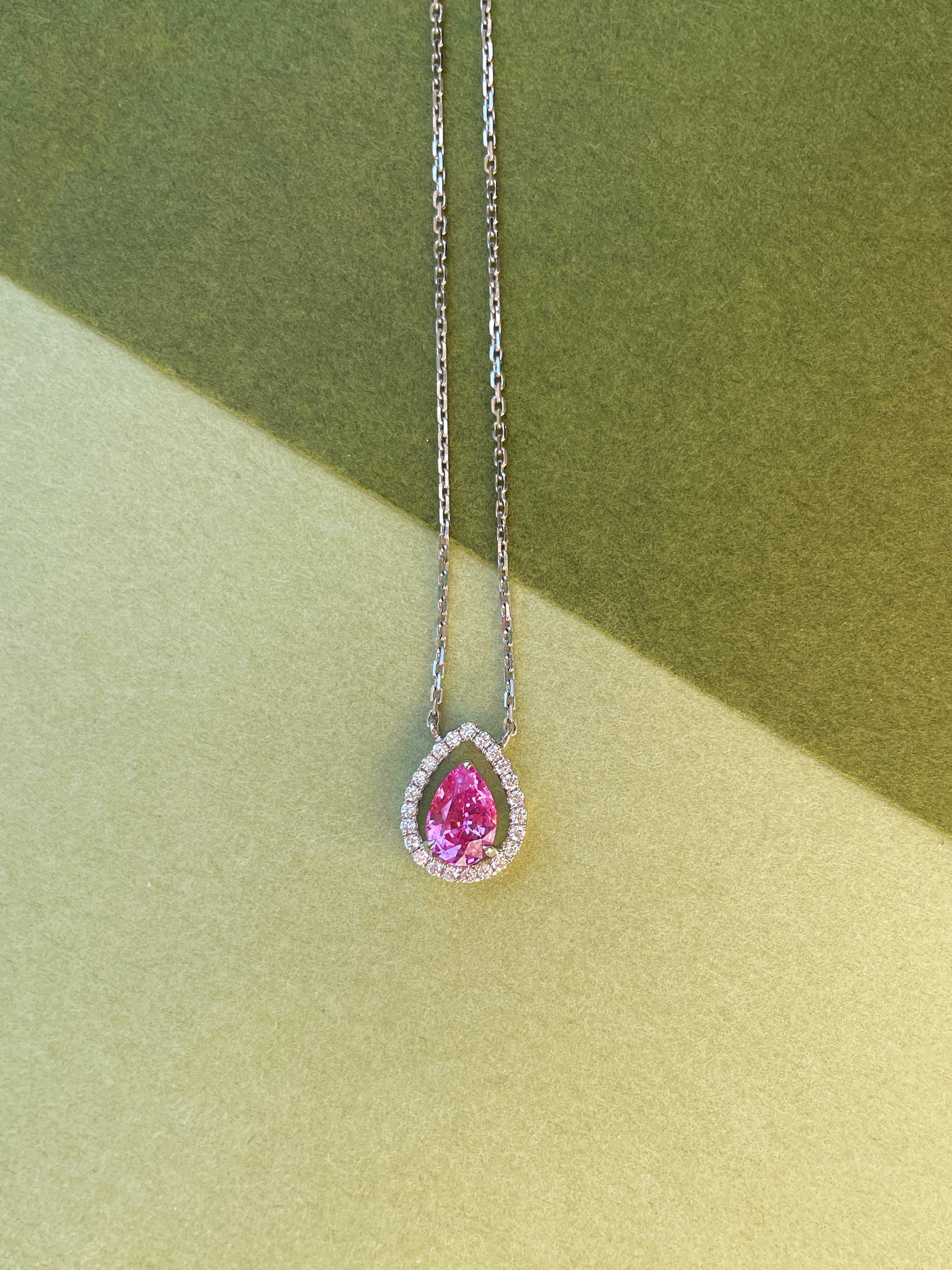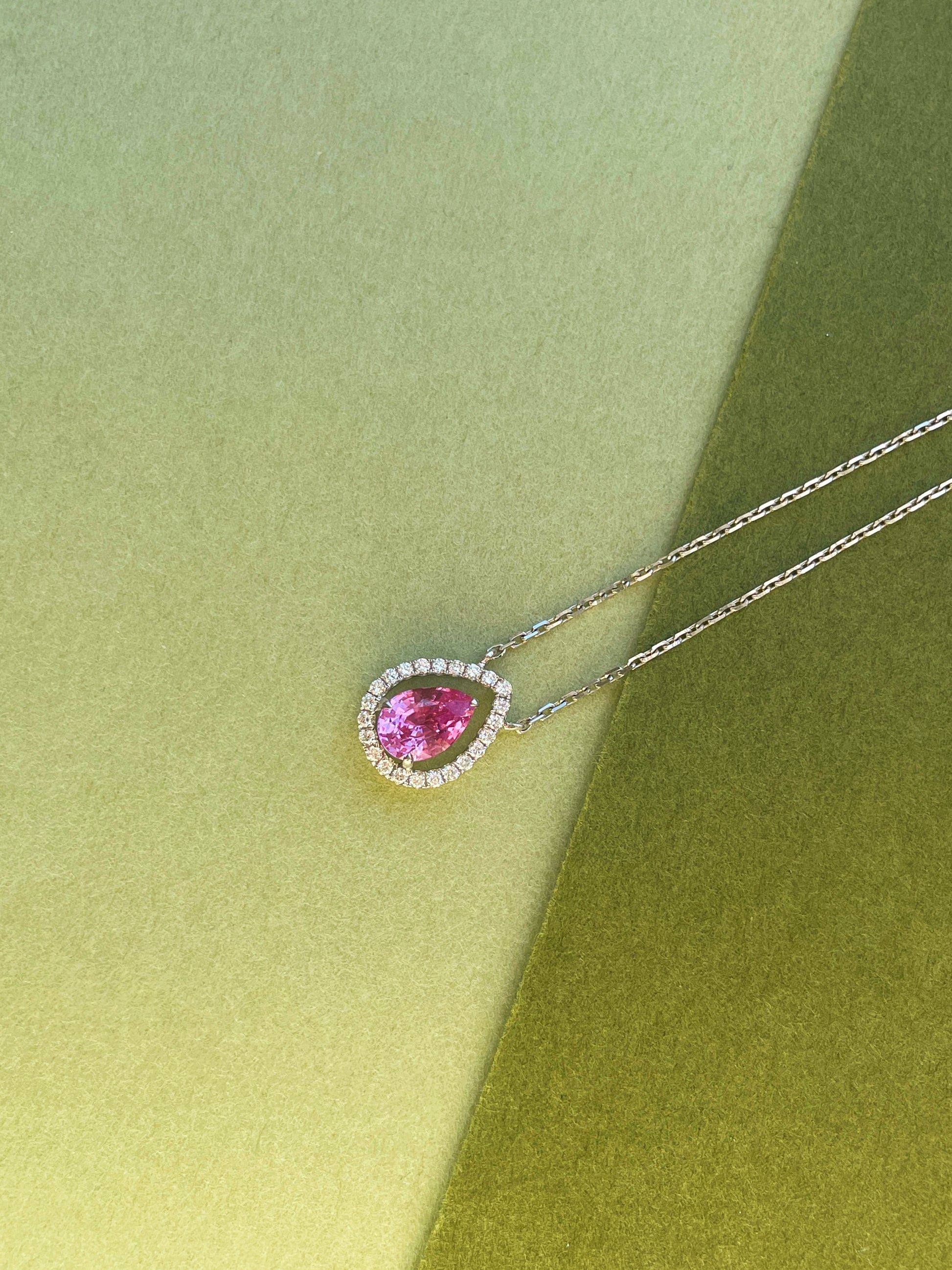 This gorgeous pendant features a natural pear shape pink sapphire that has a exceptional high saturation and showcases exceptional clarity. The sapphire is framed by a set of natural round colorless diamonds in 18k white gold.