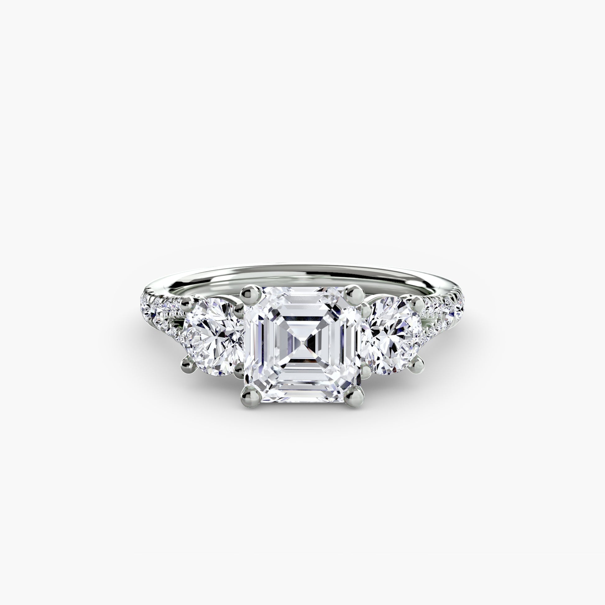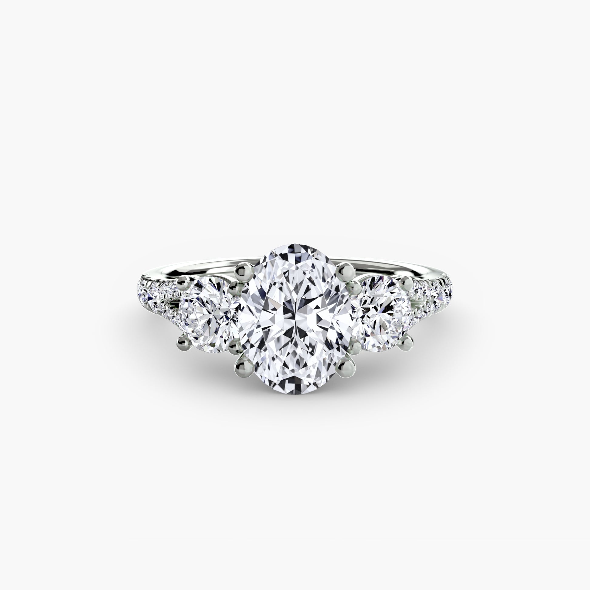 This elegant three-stone ring symbolizes your past, present, and future, elevated with a pavé band for extra sparkle and detail. A perfect union of meaning and brilliance.