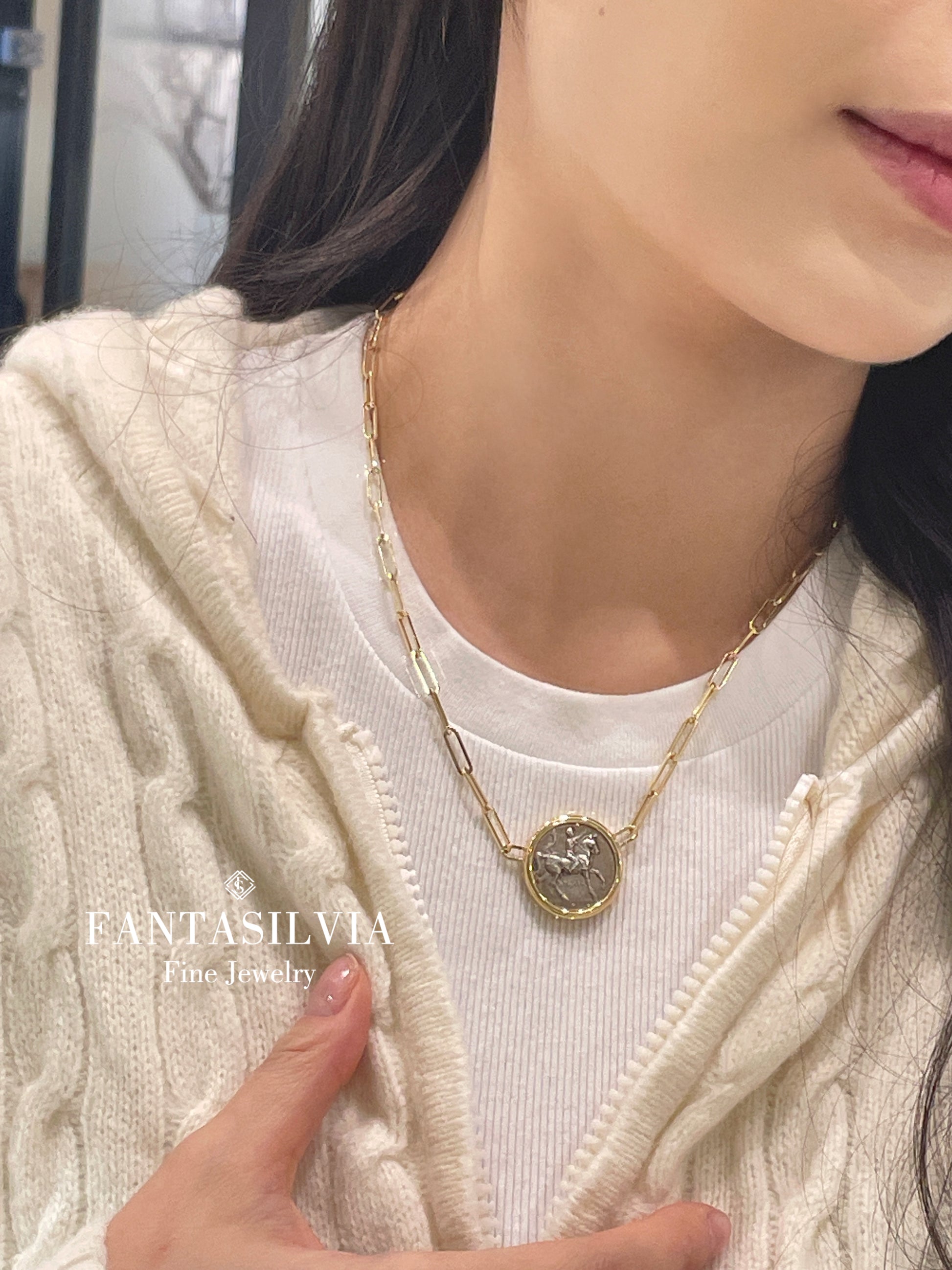 This unique pendant features an authentic ancient coin engraved with a powerful horse motif — a timeless symbol of strength, freedom, and forward motion. Encircled in a refined gold bezel and suspended from a bold paperclip chain, this piece bridges history and modern design, making it both a statement and a story to wear.